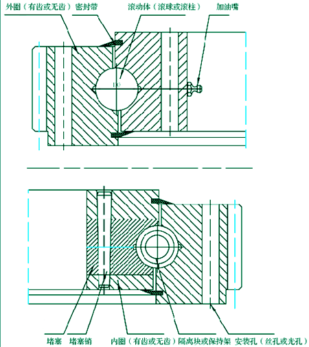 轉盤軸承根據不同的結構形式可以分為四點接觸球轉盤軸承、雙排異徑球轉盤軸承、交叉圓柱滾子轉盤軸承和三排圓柱滾子組合轉盤軸承等不同的結構形式;上述各類軸承按其是否帶齒、帶齒的分布部位又分為無齒式、外齒式和內齒式等不同結構。